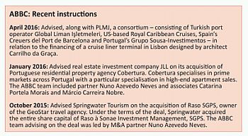 Meanwhile, the firm's headcount grew by 10 per cent in the last year to 60 fee-earners, up from 54 the previous year. But Azevedo Neves says that ABBC's recent growth is not solely down to its relationship with DLA Piper. "The relationship with DLA Piper is a very important part of our international strategy, along with strong relationships in Portuguese speaking countries and regions, such as Angola, Mozambique and Macao/China," he explains. "You don't get international work unless you have the capacity and experience, and clients clearly understand that we bring additional value," Azevedo Neves says. "Portuguese clients know that we are able to offer, from Portugal, legal services around the world, and international clients know that in Portugal there are firms working to the highest international standards."