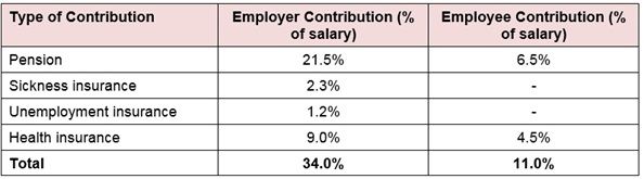 The Czech Republic has a mandatory social security system that provides pension, sickness, unemployment and health benefits. Both employer and employees are required to contribute towards the social security and health insurance schemes.