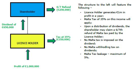 As a company resident in Malta, a License holder may also benefit from the advantageous fiscal treatment wherein a shareholder may apply for refunds equivalent to 6/7th of the income tax paid at corporate level, leaving the tax leakage to a maximum of 5% on company profits.