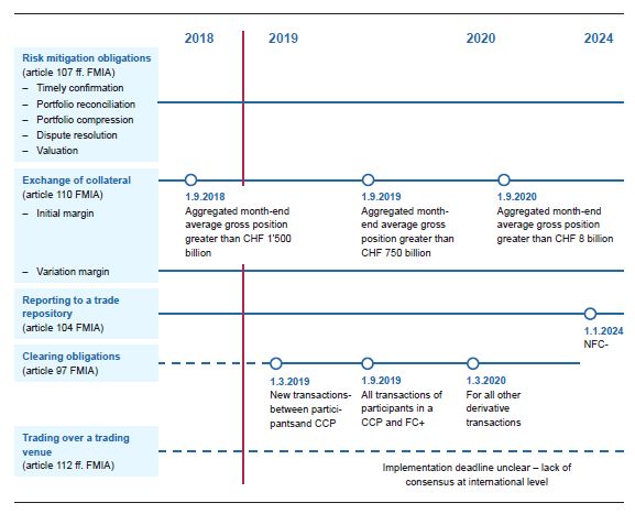 Finally, the obligation to trade derivatives over a trading venue is formally in force. However, FINMA has not yet designated derivatives as being in scope and thus has not yet triggered the phasing-in of this obligation.