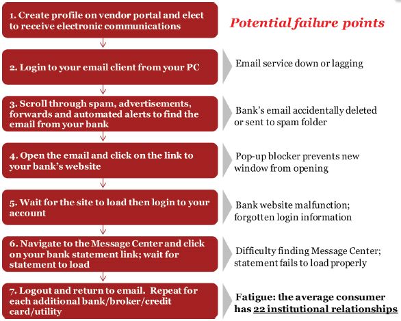 A leading reason why customers are avoiding the current alternative to paper – i.e., email – is that the user experience is frequently disjointed and inconvenient. Across the financial industry, email-based customer communication has reached a plateau. While customers are increasingly willing to conduct business online, many still receive paper based communications for their financial relationships, particularly account related materials (statements, confirms, notices, etc.).