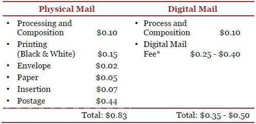 If the advantages of Digital Mail drive consumers to switch away from paper based communication, the potential cost savings are significant. On a per unit average basis, Digital Mail costs less than half as much as a paper based mailing. For firms sending out millions of mailings per year, even a modest adoption rate would translate to noticeable savings, directly impacting the bottom line. For example, a hypothetical bank with 10 million customer savings accounts could save over $5M annually with only a 5% digital mail adoption rate. For a brokerage house with a similar size client base, the savings is potentially much larger, assuming a greater volume of mailings (e.g., statements, confirms, prospectus, proxy).