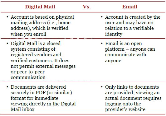 Digital Mail is an attractive option in several respects. It not only eliminates the most cumbersome aspects of email-based delivery, but it also provides strong security and identity verification, offers new opportunities for customer relationship management, is flexible enough to accommodate enhanced functionality and is easy to put into effect. Already taking hold in Europe and Asia with over 90% adoption in some markets, Digital Mail has the potential to end our reliance on email in the US and alter the dynamics of customer communications.