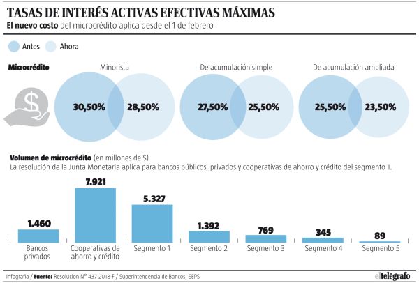 The interest rates of the three microcredit segments are 2% lower since February 1, when Resolution 437-2018-F issued by the Monetary and Financial Policy and Regulation Board (see infographic) came into effect.