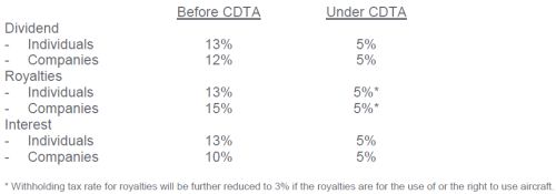 Under the CDTA, Belarus' withholding tax rate on dividend, royalties and interest payment to Hong Kong residents will be reduced as follows: