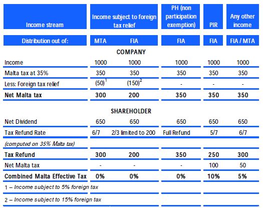 - FIA profits subject to a claim of double taxation relief. A tax refund at the rate of 2/3rd of the Malta tax would apply to dividends distributed out of profits allocated to the FIA in respect of which the distributing company has claimed double tax relief.