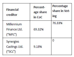 The National Company Law Tribunal, Hyderabad (hereinafter referred as "Adjudicating Authority"), after hearing to all the concerned parties on 23.01.20171 admitted the application filed by Synergies-Dooray Automative Limited (hereinafter referred as "Corporate Debtor") under section 10 of the Insolvency and Bankruptcy Code (hereinafter referred as "the Code") and had appointed Ms. Mamta Binani as an Interim Resolution Professional (hereinafter referred as "IRP"). Pursuant to the order of the Adjudicating Authority, the IRP issued the public announcement and invited claims from the creditors in order to constitute the Committee of Creditors. After collation of the claims, the first meeting of Committee of Creditor was called on 22.02.2017 in which the IRP was appointed as Resolution Professional (hereinafter referred as "RP"). Thereafter, list of the creditors was forwarded to the Adjudicating Authority reflecting the percentage of exposure and voting rights (as provided in the table below)