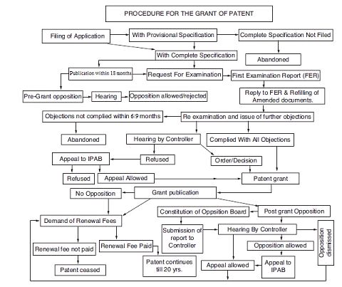 After filing the application for the grant of patent, a request for examination is required to be made for examination of the application in the Indian Patent Office within 48 months from the date of priority of the application or from the date of filing of the application. After the first examination report is issued, the applicant is given an opportunity to meet the objections raised in the report. The applicant has to comply with the requirements within 6 months from the issuance of the first examination report which may be extended for further 3 months on the request of the applicant. If the requirements of the first examination report are not complied with within the prescribed period of 9 ;months, then the application is treated to have been abandoned by the applicant. After the removal of objections and compliance of requirements, the patent is granted and notified in the Patent Office Journal. The process of the grant of patent in India can also be understood from the following flow chart: