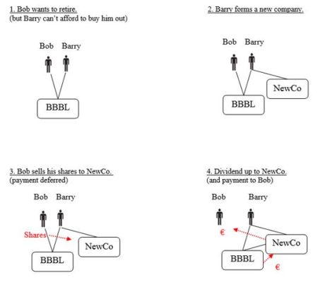 "Barry and Bob run a bakery and own 100% of the shares of BB Bakery Limited ('BBBL') equally. The company has built up cash reserves over the years and has retained profits of €1,400,000. Bob wishes to exit the business and have BBBL buyout his shares. However, rather than have BBBL purchase his shares directly, where the buy-back would trigger an income tax charge for Bob, Barry arranges to set up a new company ('NewCo') to purchase the shares. NewCo purchases Bob's shares for €700,000. The consideration in respect of the acquisition is left outstanding. BBBL subsequently pays a dividend of €700,000 to NewCo which NewCo uses to pay the deferred consideration to Bob.
