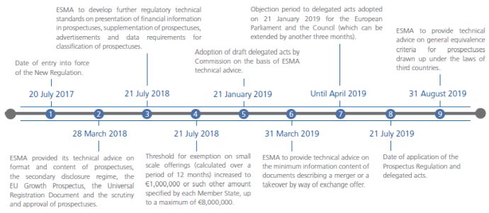The final phase of measures under PD3 will become effective in July 2019, including the fast track approval process for frequent issuers and simplified disclosure requirements for follow-on issuances. The European Commission has requested that ESMA provide technical advice on Level 2 and Level 3 measures to supplement certain elements of PD3. The first of these delegated acts are to be provided to the Commission within 13 months of its request (made in June 2018) and will deal with several matters including the format of the prospectus, base prospectus and final terms, the reduced information required under the simplified disclosure regime, the content and format of the EU growth prospectus and the procedure for approval of the prospectus.