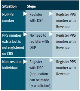 Some people may hold a valid PPS number that has not been registered in the Revenue Commissioners' CRS. Such a PPS number must be presented for registration to the Dublin Stamping Office of the Revenue Commissioners before it can be used in a stamp duty return.