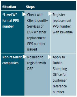 The DSP has deactivated "Level W" format PPS numbers (for wives using their husbands' PPS number) that have not already been registered in the CRS and are not in current tax usage. Such numbers will not be accepted by the Revenue Commissioners' systems and could give rise to a delay in completing a stamp duty return. In such cases the person should contact the Client Identity Services section of the DSP in Carrick-on-Shannon to establish whether a replacement number has been issued by the DSP or to arrange the issue of a new PPS number.