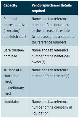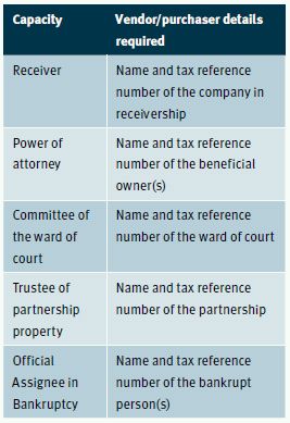 In the course of designing the e-stamping system, it was recognised that in certain cases the tax reference number of a party acting in a fiduciary capacity would not be required to be included in a stamp duty return. The Revenue Commissioners have issued guidance on what tax reference numbers should be entered in the stamp duty return in certain situations. The table contained in the Revenue Commissioners' current guidance notes is reproduced below.
