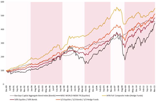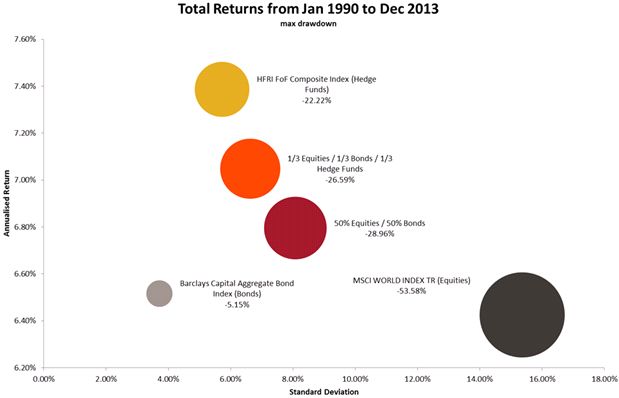 As can be seen from the chart below, over the long term hedge funds (after fees) have outperformed traditional asset classes. Similarly a portfolio with 1/3 allocated to equities, 1/3 to bonds and 1/3 to hedge funds over the last 24 years also comfortably outperformed a traditional balanced portfolio with 50% invested in equities and 50% invested in bonds.