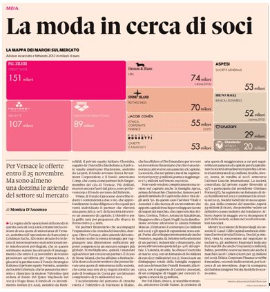 In addition to Versace, in the past months many other brands such as Stone Island, Harmont & Blaine, Chantecler, Peuterey and Fratelli Rossetti have appointed financial advisors in order to find a possible financial partners interested in the purchasing of at least a minority participation as shown in the following table from Sole24ore dated November 8, 2013.