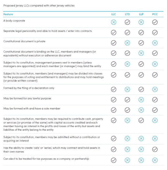 As outlined by the Consultation, the LLC is an entity historically based on mainland-European equivalents (GmbH and S.à r.l). Its popularity means that LLC formations now account for over two-thirds of all transparent vehicle choices in the US each year. A comparison of the main characteristics of the proposed Jersey LLC with other Jersey vehicles is provided in table form at the end of this Article.
