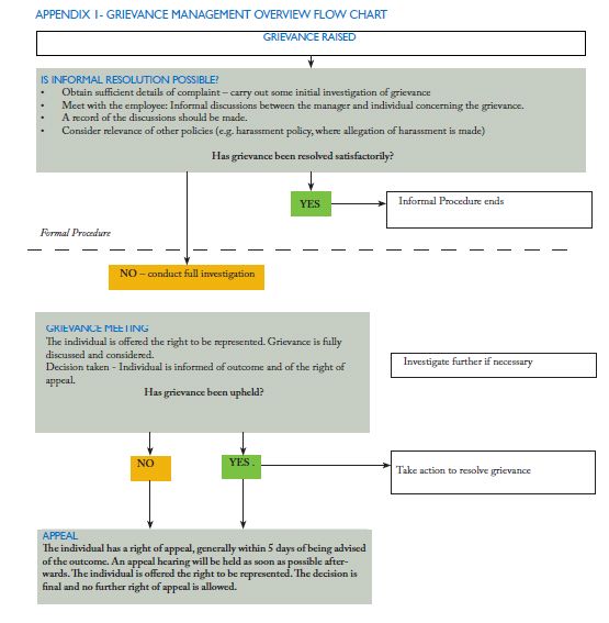 The following sets out a typical example of how a grievance procedure should operate. We have based this example on a simple two stage process – e.g. grievance and appeal. However, more complex multi stage processes are often utilised.