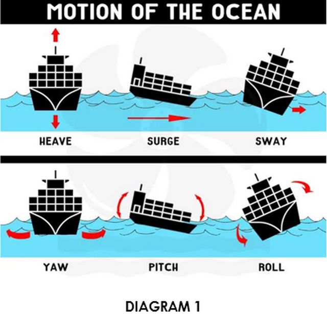 The importance of proper packing of cargo should not be overlooked especially when the container travels by sea. Even though containers undergo thorough testing to withstand various stresses, relying solely on this protection is not sufficient. When the container is on board a ship and the ship is sailing, there are 6 ways in which the ship can move as shown on Diagram 1.