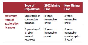 Under the new Mining Law operators are given shorter timeframes in which to conduct exploration activities, an example of which is in relation to the maximum term of exploration licences (as detailed in the table below).