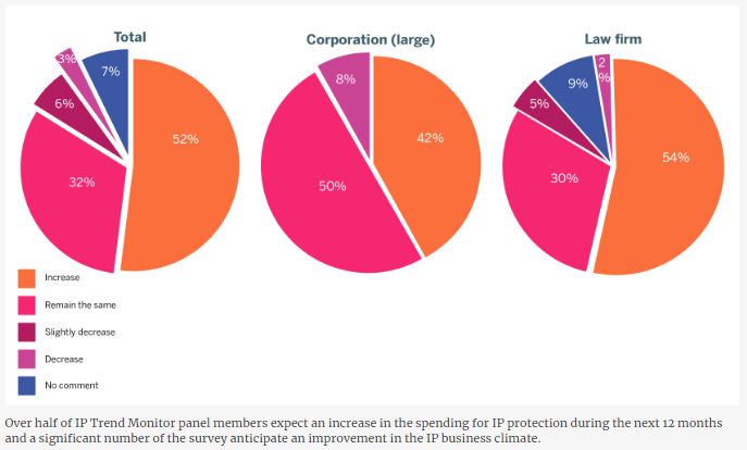 The IP industry is embracing all new digital technology trends with 46% of the panel members expecting a significant improvement in the business climate for IP rights. Besides, 52% of the respondents anticipate an increase in the spending on IP protection within the next year, while only 3% think it will decrease.