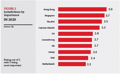 Hong Kong, Singapore, London and Dubai all meet the criteria for super jurisdiction to some degree. All have a strong employee base, sound business, residential or travel infrastructure, and financial and legal services for clients. All are large cities or city states that now compete with offshore and midshore jurisdictions. Industry respondents believe this trend will continue over the next five years.