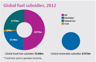 The IEA's latest estimates (for consumption) indicate that fossil fuel consumption subsidies worldwide, amounted to $548 billion – see graph opposite. This is the equivalent to four times the value of subsidies to renewable energy and more than four times the amount invested globally in energy efficiency improvements.