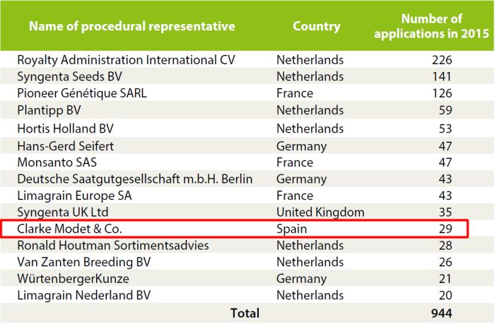 According to the latest report of the Community Plant Variety , Clarke , Modet & Cº is the largest European IP agent by volume of presentations within this office.