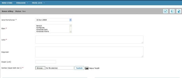 Gambar 1. Tampilan Pengajuan Desain Industri secara online melalui website Ditjen Kekayaan Intelektual (https://efiling.dgip.go.id/efiling/login) didalamnya ditampilkan informasi : jenis permohonan Desain yang terdiri permohonan untuk UMKM dan non UMKM, klaim desain industri yang dilindunginya yang terdiri dari bentuk, konfigurasi, komposisi garis dan komposisi warna, Judul Desain Industrinya, kegunaan desain Industrinya, Desain (unit), dan Upload Gambar.