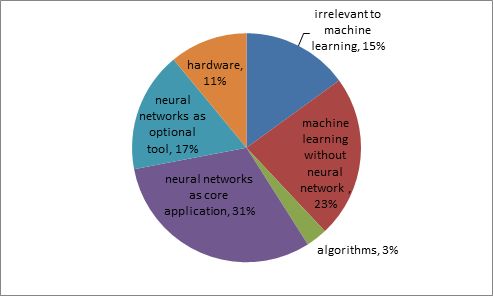 - With respect of filings within the three major application fields, i.e. "transportation," "personal devices, computing and HCI", and "predictive analysis," only 24%, 30%, and 29% of them, respectively, claim for inventions in which neural networks are used as core technical means. In these three categories, most inventions addressing machine learning still rely upon logic programming.