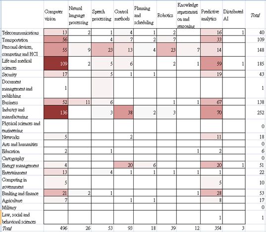 Following the methodology of the WIPO Report again, the TIPO's Report provides a cross-tabulation analysis with "AI functional applications" and "AI application fields" of the located 1,567 inventions, and the findings are as follows.