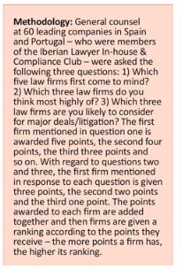 In-house lawyers at leading companies in Spain and Portugal were surveyed to find out which were the best law firm brands in both countries. The power of the brand is calculated using a methodology commonly employed by legal researchers and consultants worldwide. Survey participants are asked three questions: Which five law firms first come to mind? Which three law firms do you think most highly of? And, which three law firms are you likely to consider for major deals/litigation?