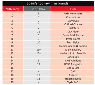 There were a number of firms who were ranked in the top 20 law firm brands in Spain that were not ranked last year. They included Jones Day and Bird & Bird – Jones Day has a good reputation for major deals and litigation, while Bird & Bird scored well in terms of being 'front of mind' with in-house lawyers.