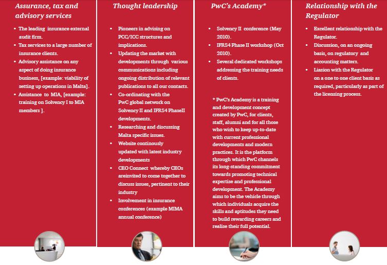 PwC also makes available a range of other services in Malta designed to provide businesses and organisations with a coordinated package of services that will contribute to future growth, efficiency and prosperity. The firm is currently responsible for serving a large and diverse client portfolio comprising some of Malta's top companies. Its client list includes a number of public companies and institutions, private companies both large and small, foreign and local, and Government related companies. The annual report, 'Review Malta Firm' provides more insight into the Malta practice, and includes a list of insurance clients.