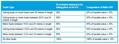 In terms of the guidelines, a short-term charter of a yacht is an agreement whereby the yacht owner / operator contracts the use of the yacht, for a consideration, with a crew or on a bare boat basis for not more than 90 days. In the absence of the new interpretation, where such yacht is put at the disposal of the customer in Malta and will be used for leisure purposes, 18% Malta VAT would have been due on the charter fees charged. As a result of the VAT Department's interpretation, however, the Malta VAT chargeable on the charter is limited to that portion of the use of the yacht within the territorial waters of the EU.