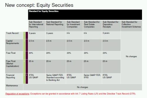 The following table gives on overview of the requirements in the two new standards compared to the status quo (source SIX Swiss Regulation: http://www.six-exchangeregulation.com/download/regulation/vernehmlassung/presentation_consultation_20141009_en.pdf (visited on 19 February 2015)):