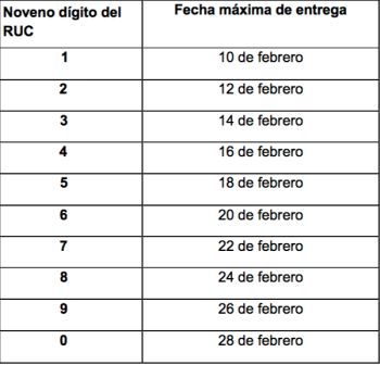 La información deberá ser entregada a través del Anexo de Accionistas, Partícipes, Socios, Miembros de Directorio y Administradores. La información a reportar será aquella con corte al 31 de diciembre del respectivo ejercicio fiscal y se presentará en el mes de febrero del ejercicio fiscal siguiente al que corresponda dicha información, considerando el noveno dígito del Registro Único de Contribuyentes (RUC) del sujeto obligado, según el calendario señalado a continuación:
