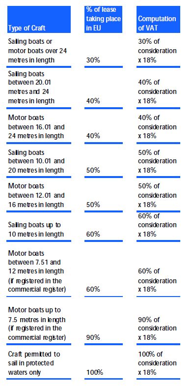 Thus, for example, a sailing boat that is over 24 metres in length is deemed to be used for 30% of the time in EU territorial waters and for 70% of the time outside EU territorial waters. Consequently, Maltese VAT would be chargeable by the lessor to the lessee on 30% of the lease payments, whilst no VAT would be chargeable on 70% of the lease payments as they are considered to be in relation to the time the yacht was used outside EU territorial waters.