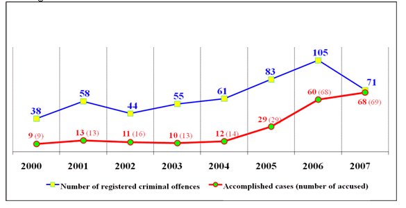 Shortly after joining the EU, Latvia got into the list of infringers of the intellectual property and stayed there quite a long time (2004 -2007).44 Liability for the intellectual property infringements is still too weak. Dissatisfaction has always been expressed publicly.45 Despite the legislative proposals on amendments, they have not left any remarkable consequences. Liability under Article 206 of the Criminal law (Unlawful usage of a trademark, other distinctive sign and a design) occurs only by an accomplished crime which, considering the organized nature of such actions, may only be proved by proving that the individual actions exercised in the entire chain of the crime may be qualified as accomplished" i.e. the collective effort of the criminals were crowned" with the sale of the final product" which is practically impossible to be proved until all engaged parties have been caught that usually act in different spheres and frequently – in different states. Thus despite the relatively high percentage of the forgeries46, the number of the initiated criminal proceedings and the persons called to criminal liability is insignificant (see Diagram no 2).