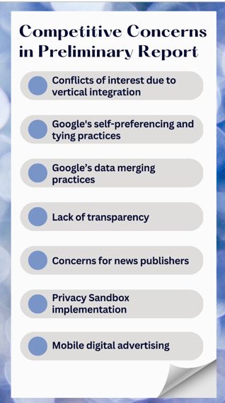 The Preliminary Report emphasizes the concern that Google may abuse its market power in the ad tech market by providing advantages to its other services or by leveraging its dominance in the general search engine market to favor its own services in the ad tech market. The Report states that information gathered during the sector inquiry indicates the tying practice of requiring the use of Google's DSP to access YouTube ad inventory. Such practice would be concerning from a competition perspective if advertisers prefer to work with only one DSP. Additionally, by referencing the decisions and studies in other countries, the Preliminary Report expresses concern over Google's advantage in ad auctions' dynamic allocation and header bidding processes. It states that this may potentially allow Google to promote its own ad technologies.