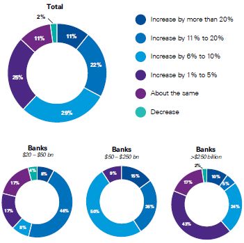 Our survey results reveal optimistic expectations as 87 percent of the banking executives surveyed foresee revenue growth in the year ahead. Larger banks are more modest in their growth predictions, with 43 percent expecting to see growth of up to five percent, while 46 percent of their smaller counterparts are more optimistic, anticipating revenue growth in 11 to 20 percent range in the next twelve months.