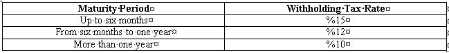 The withholding tax rates on interest paid for time deposits and premiums paid for participation accounts are determined based on the maturity period and the currency of the deposit, pursuant to the Council of Ministers Decree No. 2012/4116 (published in the Official Gazette in January 1, 2013 and No. 28515), which amended the Council of Ministers Decree No. 2006/10731 (published in the Official Gazette in July 23, 2006 and No. 26237). Please find below the new withholding tax rates;
