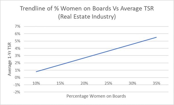 Frei earned her reputation when she was hired by Uber to help fix their " Bro Culture". Although this a step in the right direction, WeWork might benefit from adding more women to their portfolio of directors. Using CGLytics data and intelligence a trendline can be made, in the S&P 500 real estate industry, between the percentage of women on boards and a company's Average 1-year Total Shareholder Return (TSR).