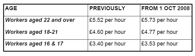 The National Minimum Wage Regulations 1999 (Amendment) Regulations 2008 came into force on 1 October 2008 and changed the minimum rates as follows:
