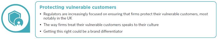 In the same way as regulators are requiring financial institutions to consider social criteria in their "company purpose", we also see them looking to firms to ensure that vulnerable customers receive appropriate protection. This is part of a wider debate which also draws in other industry sectors, including in particular power, water and telecommunications. The dial has moved away from the principle of "buyer beware" – and there has been much discussion about the definition of vulnerability, the extent of financial institutions' responsibilities with regard to vulnerability, and whether regulatory action alone can deliver a good outcome for the vulnerable or the excluded in society.
