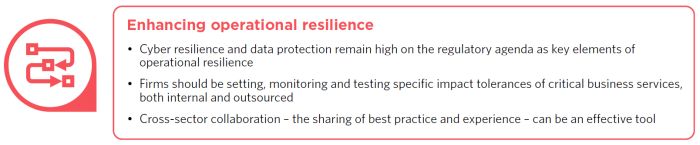 Operational resilience will remain a focus for the regulators and market participants for at least the medium term, not least because of the pace and scale of technological innovation, change management, interconnectedness, third party dependencies and cyber threat within the financial services sector. Firms have to respond to this challenge by meeting the regulatory expectations above, in particular by ensuring: