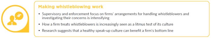 Globally, regulatory frameworks supporting whistleblowers are at varying stages of evolution. This can create additional complexity for firms operating across jurisdictions, particularly where aspects of their global operations are centralised in a jurisdiction whose whistleblowing requirements are less stringent or materially different to other jurisdictions where the firm operates, in particular in terms of the types of disclosures that are given whistleblowing protection.