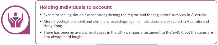 The position elsewhere similarly remains focused upon individual accountability in 2020. In Hong Kong we expect to see the SFC continue to use the Manager in Charge regime as a roadmap for identifying senior individuals responsible for misconduct, and for investigations of these senior individuals to intensify. We also anticipate a continued focus by the SFC on directors of listed companies engaged in fraud or malfeasance and for it to wrap up the last of its IPO sponsor cases. This follows concerted efforts by the SFC in these areas during 2019, with the SFC taking action against multiple IPO sponsor principals during the course of this year, and a doubling in the number of directors removed or banned for fraud since 2017.