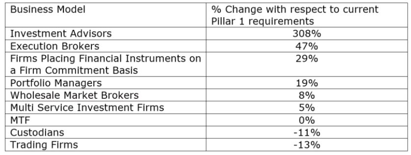 However, as the above table demonstrates, the capital increases will not fall evenly across the different types of firms operating in this sector. Many investment advisors, which would not previously have been subject to a risk-based capital requirement, will experience the highest percentage Pillar 1 capital increase of 308%, while custodians and trading firms are anticipated to see a fall in Pillar 1 requirements.