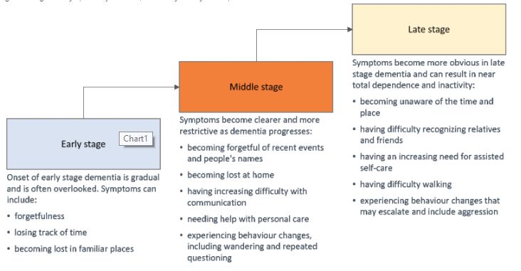 Dementia is not a specific disease but a term that describes a group of symptoms associated with a decline in memory, thinking, behaviour and the ability to perform everyday activities. The World Health Organization characterises dementia into three stages, each of which are distinguished by a variety of symptoms (see Figure 1). It affects around 50 million people around the world – mainly older people, although it is not a normal part of ageing, as is believed by many. Nearly 60 per cent of those with dementia live in low and middle-income countries, and due to the world's growing and ageing population, there are nearly 10 million new cases every year. It is one of the major causes of disability and dependency worldwide among older people and has significant physical, psychological, social and economic impacts, not only on people with dementia but also on their carers, families and society.1