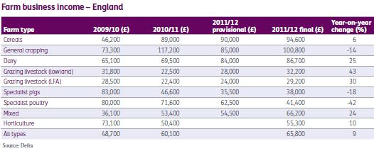 Defra has released updated farm business income figures for England. They show the profitability of different farm types for the 2011/12 year (February to February). These figures update those that were published in January. There are considerable changes from the provisional figures and major changes from last year's figures. With the exception of specialist poultry, the figures for all sectors have increased since the provisional numbers were released, some substantially, such as the general cropping, which is almost 20% higher.